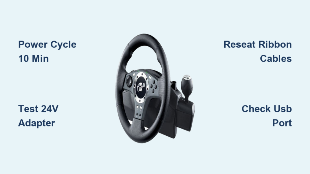 Unplug both the USB cable and power adapter from the wall—don’t skip either. Wait three full minutes (not 30 seconds) to drain residual power from internal capacitors. This hard reset clears temporary MCU glitches better than quick unplugging. Reconnect power first, let the wheel initialize for 10 seconds, then plug in USB. If the left light stabilizes to solid green, you’ve cleared a firmware hiccup.